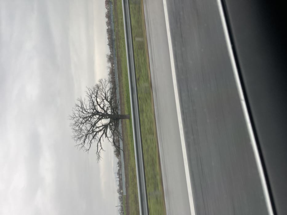The image depicts an exterior scene observed from a moving vehicle, presumably in the vicinity of Kolarovo, Bulgaria. The foreground shows the dark interior edge of a vehicle's window frame. Immediately beyond, a wet, dark asphalt road with a solid white line on its right edge stretches horizontally, exhibiting motion blur. Parallel to the road, a silver-colored corrugated metal crash barrier is visible, separating the road from a strip of green grass. In the mid-ground, a large, bare deciduous tree with a wide, spreading canopy stands prominently within a green field. The tree lacks foliage, indicating autumn or winter. In the background, a line of smaller, bare trees or bushes extends horizontally, with indistinct structures or buildings visible behind them. The sky is uniformly overcast with shades of grey, indicating a cloudy day. No individuals are present in the scene.