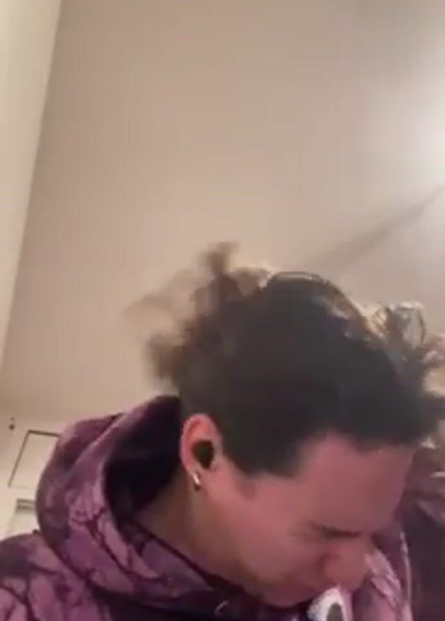 A light-skinned person with long, wavy dark brown hair and a purple tie-dye hoodie is facing the camera. The person's hair is initially short and then is vigorously shaken to reveal the full length. The person is indoors, with white walls visible in the background. A small air conditioning unit is visible on the wall. The person does not speak.