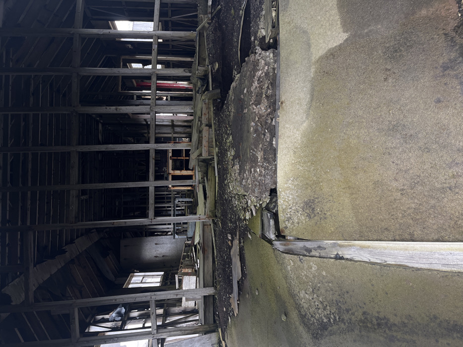 The image displays the interior of a dilapidated wooden structure. The framework of the building is visible, with beams and supports creating a grid-like pattern. Light streams through gaps in the structure, highlighting the decay. Concrete and debris fill part of the frame. The overall impression is one of abandonment and disrepair.