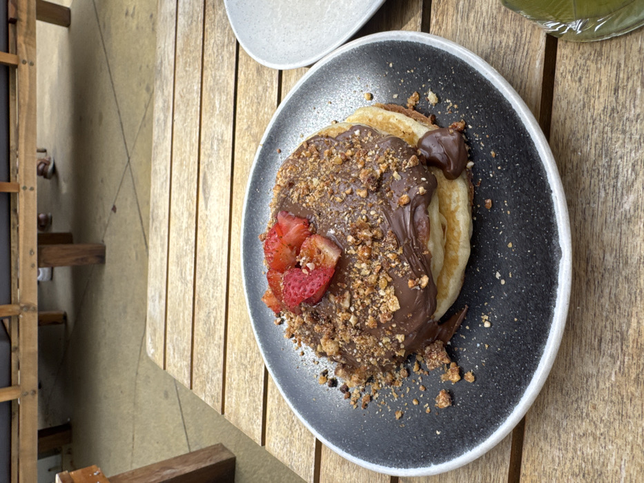 - "The image depicts a stack of pancakes served on a dark grey ceramic plate with a white rim, positioned on a light wooden slatted table in an outdoor dining setting in Colares, Portugal" by FM-6wyrF3, licensed under CC BY 4.0