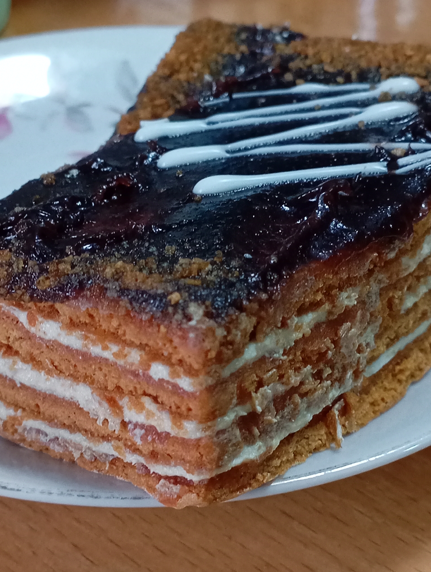 A triangular slice of layered cake is centered on a white ceramic plate. The cake consists of approximately six horizontal layers of light brown cake alternating with white cream filling. The top surface is covered with a dark, glossy, reddish-brown glaze, decorated with four distinct, parallel thin white lines of icing or cream, along with scattered brown crumbs. The white plate exhibits a faint, light-colored floral or leafy pattern near its rim. The plate is positioned on a light brown wooden table surface with a visible diagonal grain pattern. The scene is located in the city of Kurganinsk, Russia.