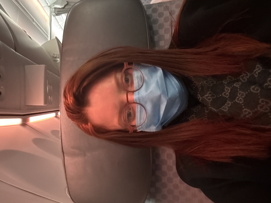 A person with red hair, wearing round glasses and a light blue surgical mask, sits on an airplane