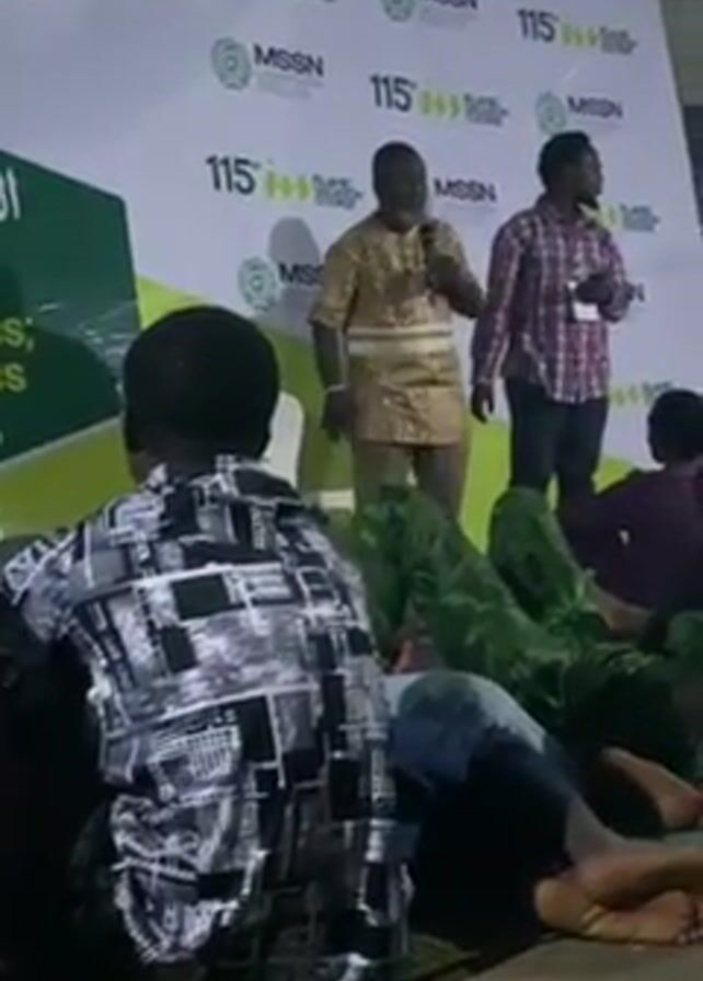 A man in a tan and black patterned shirt stands on stage with a microphone, speaking in front of an audience. He is accompanied by another man wearing a red and black plaid shirt. Behind them is a large white banner with green and black lettering and logos. The audience members are sitting on the floor, facing the stage. Some are lying down, while others are sitting up. One audience member is wearing a black and white shirt. The lighting is dim, and the scene appears to be indoors.