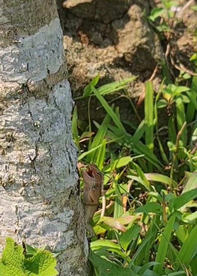 light-brown lizard clinging to the side of a tree. The lizard's mouth is open, and it appears to be eating or vocalizing. The tree has light-gray bark with darker patches. There is lush green grass and foliage around the base of the tree. A large rock can be seen in the background.