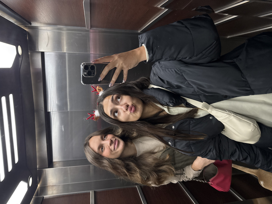 Two young women take a selfie in an elevator. The woman closest to the camera has long brown hair and smiles. The woman holding the phone makes a kissing face and wears reindeer antlers. Both wear jackets. The elevator has metallic walls and wood paneling near the floor. A red purse hangs on a silver chain.