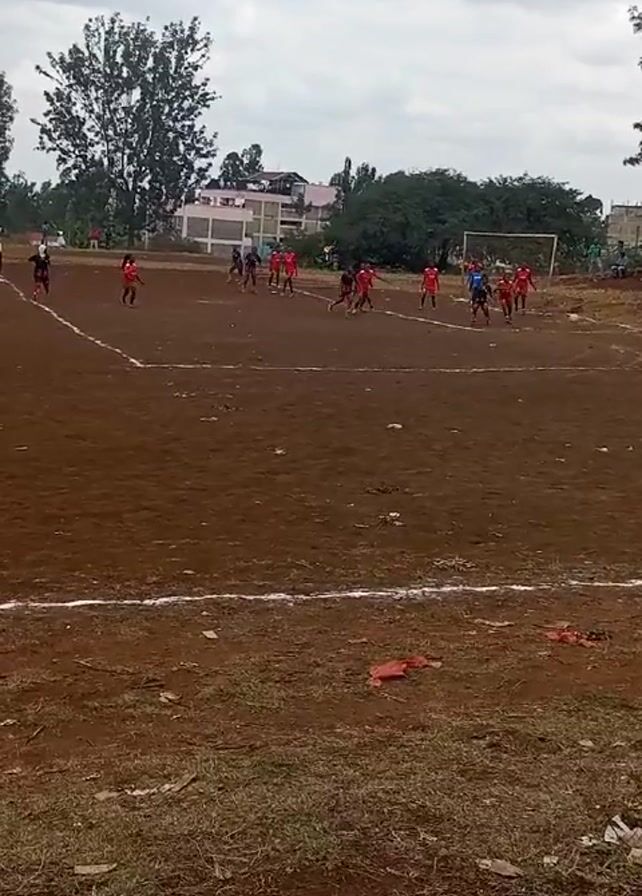 A wide shot video captures a soccer game on a dirt field. Two teams are distinguishable by their red and black jerseys, and they are actively engaged in play, moving around the field and kicking the ball. A goal is visible in the background with a player in a blue jersey standing guard. The field is defined by white lines. In the background are buildings, trees, and an overcast sky. The edges of the field are grassy and littered with some debris.