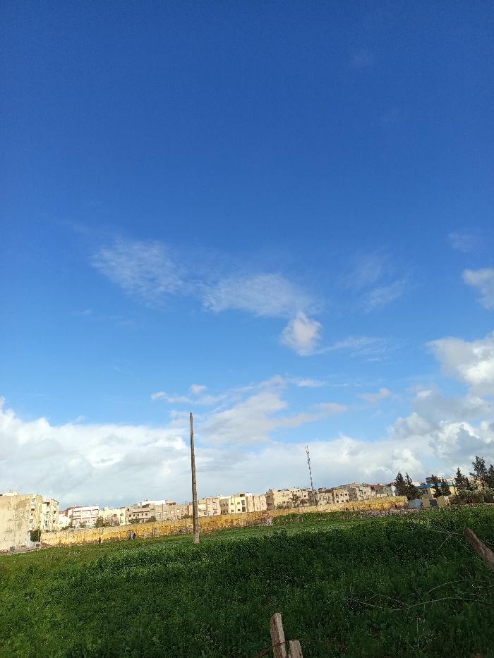 A vibrant blue sky with scattered white clouds dominates the scene. Below, a green field stretches towards a cityscape comprised of low, light-colored buildings. A tall, thin pole stands in the field, while trees are visible on the right. The foreground features vegetation and fence posts, adding depth to the landscape. The overall impression is one of openness and a blend of nature and urban elements under a bright sky.
