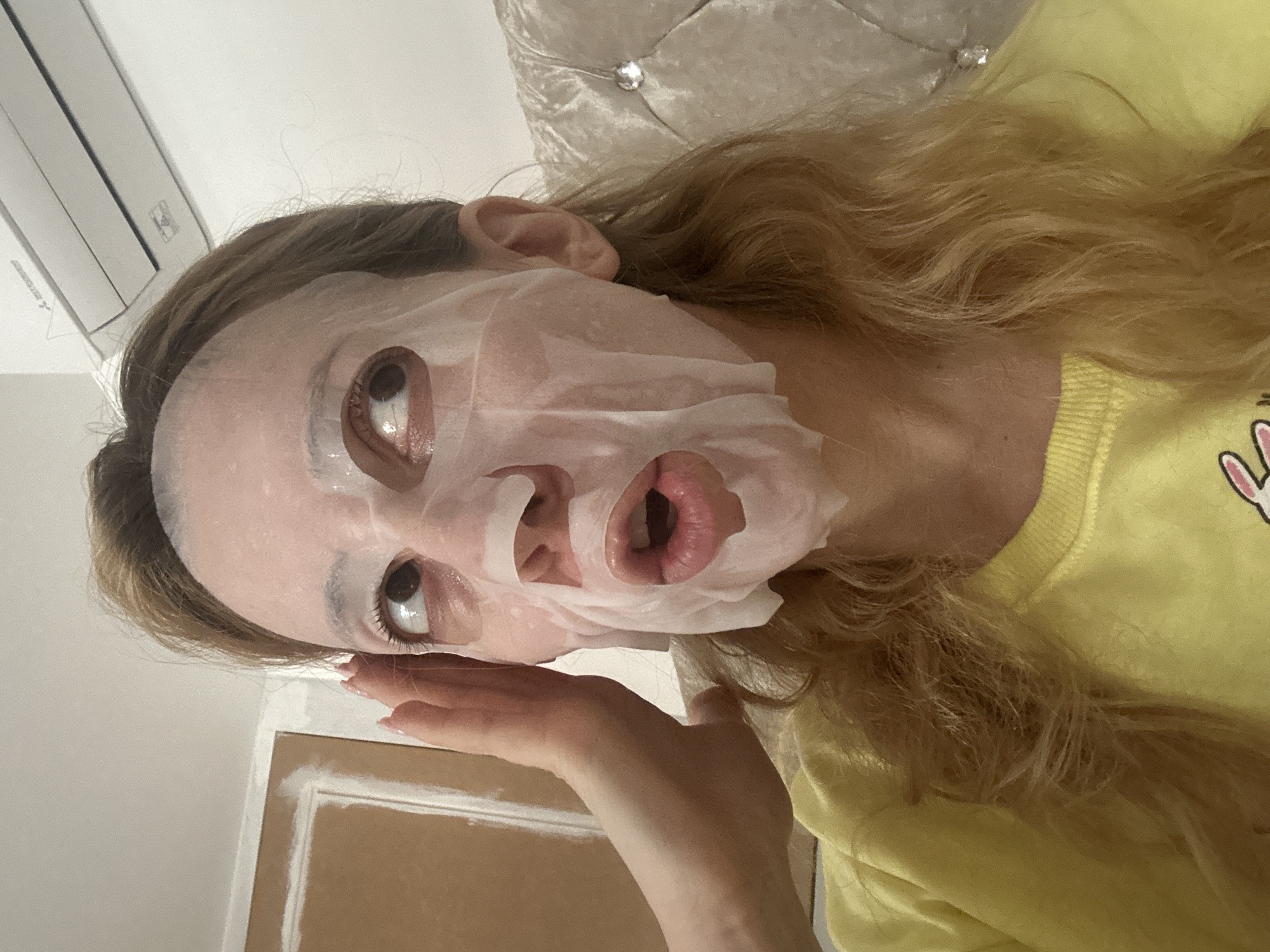 A woman with blonde hair is wearing a white sheet mask on her face. She is wearing a yellow t-shirt and has her hand near her face. The background includes a white wall, an air conditioning unit, a padded headboard, and a doorframe. There is no indication of location in London, United Kingdom.
