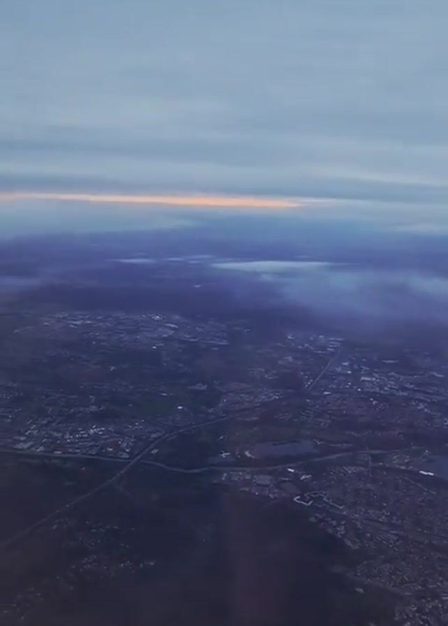 n aerial view of a city landscape. The city has buildings and streets visible below, viewed through the plane's window. The sky is overcast, with light breaking through at the horizon line. The overall color palette is blue and gray. A voice announces that smoking is prohibited.