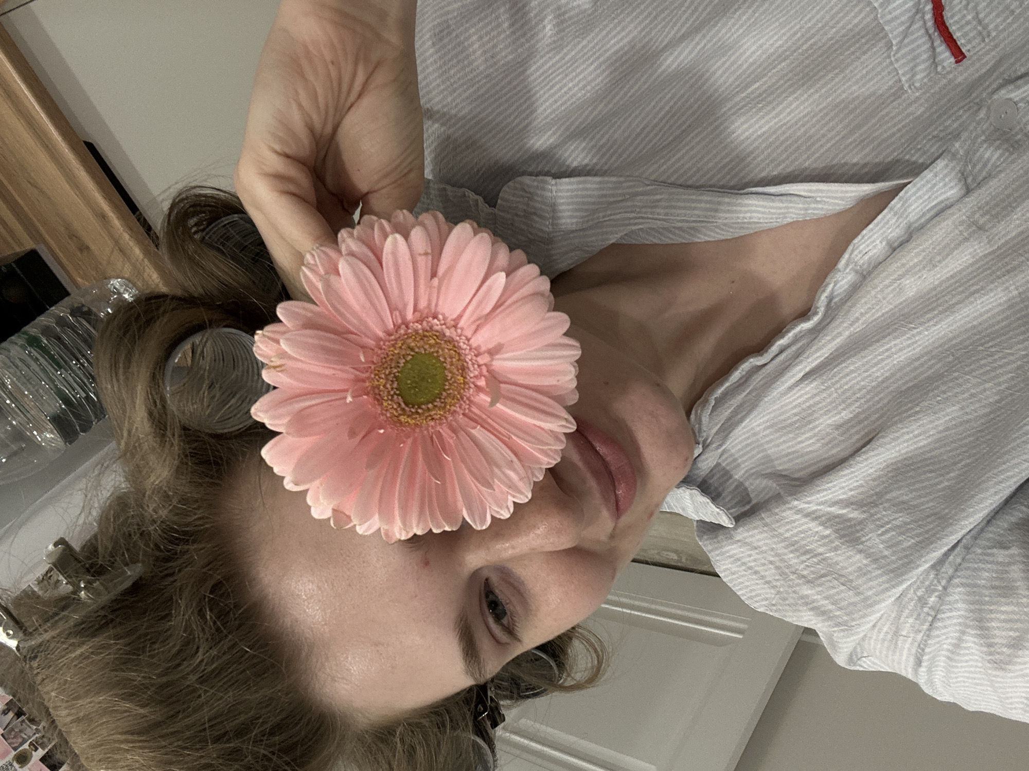 - "A woman lies on her side in an interior setting, holding a pink gerbera daisy in front of her face" by FM-iSKVh2, licensed under CC BY 4.0