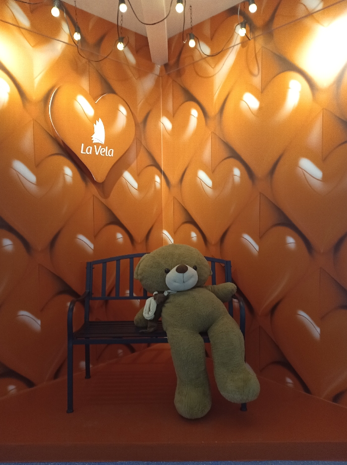 The image displays an indoor corner setup located within Centro Comercial La Vela in Porlamar, Venezuela. The two visible walls are covered with a repeating pattern of glossy, embossed heart shapes in varying shades of orange and brown, exhibiting reflective surfaces. A string of exposed incandescent light bulbs is suspended horizontally near the ceiling junction of the two walls, providing illumination. A dark-colored metal bench with a slatted seat and backrest is positioned against the corner. On the bench, a large, light brown or olive-green teddy bear is seated, with its legs extending forward onto an elevated orange platform. The teddy bear features a lighter-colored snout and dark eyes; a smaller, dark brown stuffed animal or a folded accessory is tucked near its left arm. A narrow blue strip is visible at the base of the orange platform.