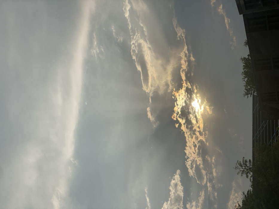 bright sun shining through a cluster of clouds. Sunlight streaks downwards, illuminating the surrounding sky. To the right, the edge of a building is visible, accompanied by foliage. The overall scene conveys a sense of atmospheric beauty. The photo's perspective is tilted to the side, and the light conditions give it a hazy quality.