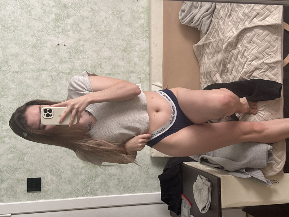 A slender woman with long brown hair is pictured in a mirror selfie. She wears a gray short-sleeved shirt and dark blue Calvin Klein underwear. Her phone obscures part of her face. The background features a textured wall, a bed with a white quilt, and a cluttered surface. A black square, possibly a light switch, is visible on the wall.