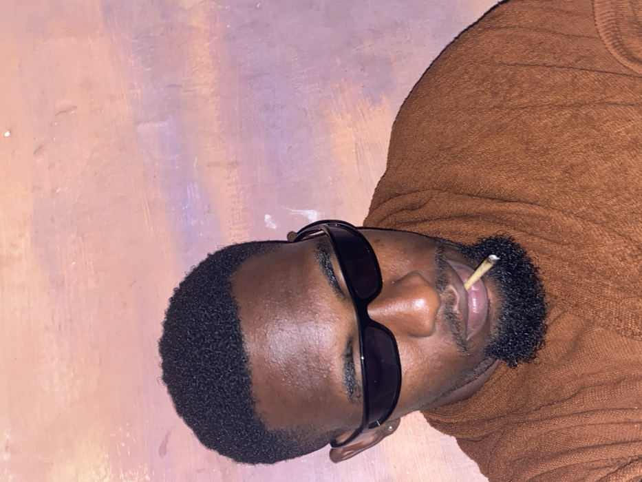 A man with dark skin and a short, curly haircut lies on a textured surface. He wears sunglasses and a brown sweater. A lit cigarette is held in his mouth. His trimmed beard is visible, and a small earring is on his right ear. The background is a mottled pink and purple. The image is slightly tilted.
