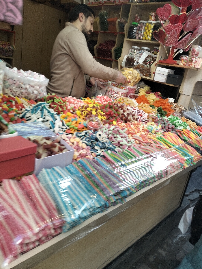 The image captures a candy stall within Barza Municipality, Syria