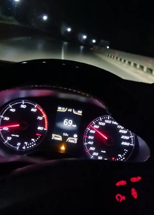 car driving at night. The camera is positioned from inside the car, behind the steering wheel, showing the dashboard and the road ahead. The dashboard instruments, including the speedometer and tachometer, are visible and illuminated. The speedometer indicates the car's speed fluctuating between 69 and 78 km/h. The road is wet and illuminated by streetlights. There is a barrier along the right side of the road. No people are visible, but the presence of a driver is implied by the perspective. The overall environment appears to be a highway or major road.