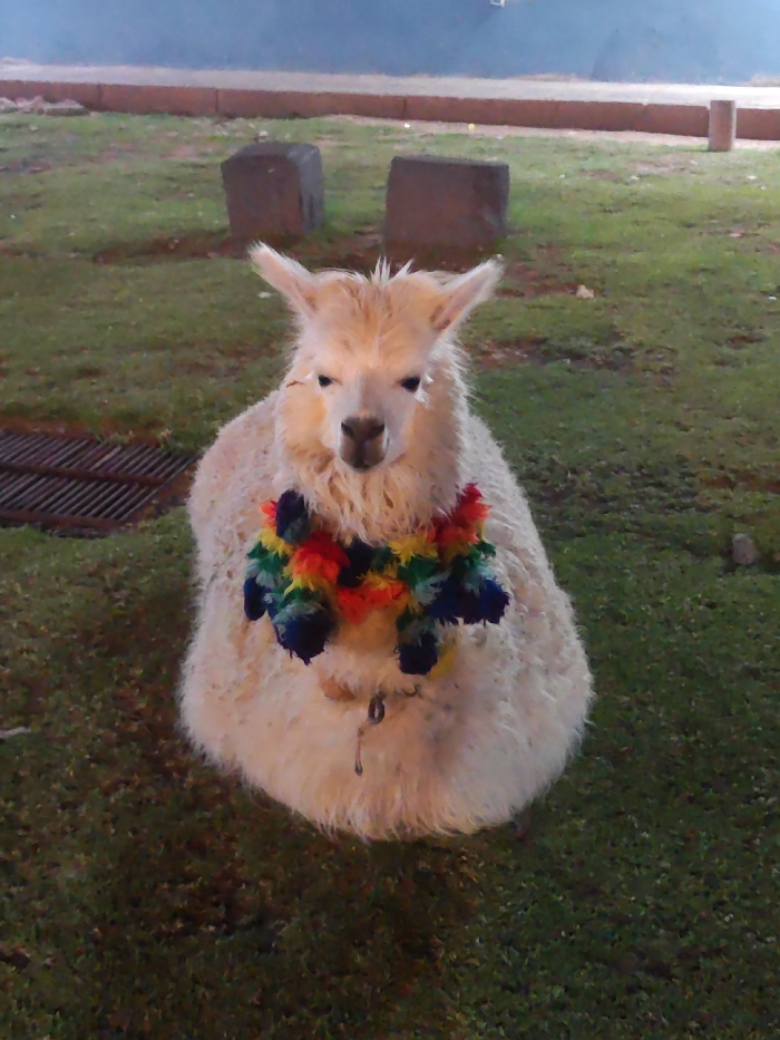 - "A light-colored alpaca, exhibiting shaggy, off-white fur, sits upright on a grassy area in the city of Cuzco, Peru" by FM-20kwN2, licensed under CC BY 4.0