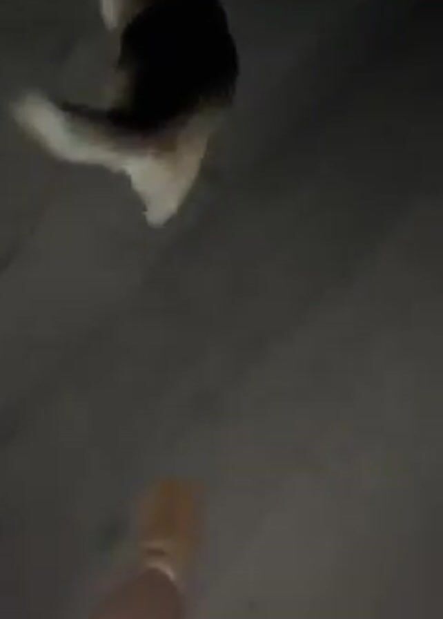 A person is walking a corgi dog on a leash on a dark, possibly paved surface. The person is wearing brown shoes and light-colored pants. The corgi is mostly tan and black with some white markings. The dog stops and looks up at the person, and the person continues walking. The person may have laughed or made a noise during the scene.