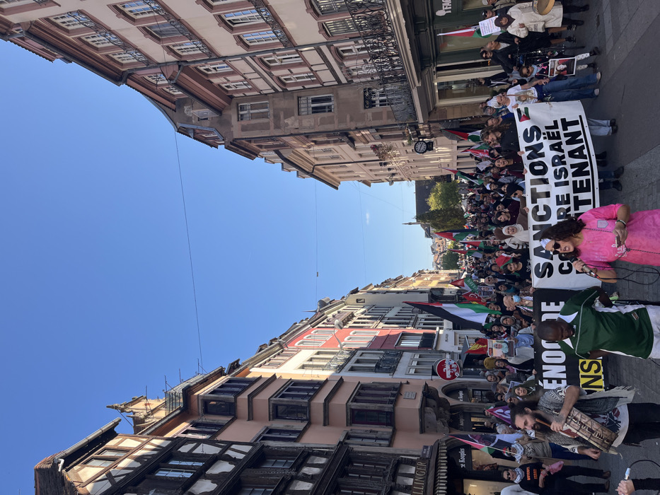 The image depicts a daytime street protest march occurring on Rue de la Haute Montée in Strasbourg, France