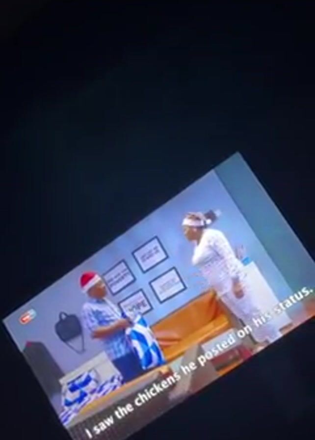 A rectangular television screen displaying a scene from what appears to be a film or television show is tilted at an angle against a black background. The scene features two individuals in a well-lit living room setting. A man wearing a blue plaid shirt, jeans, and a Santa hat is holding a blue and white striped bag. He is standing near a light-colored sofa. A woman, dressed in white patterned pajamas and a holiday-themed hat, is standing facing him. The room includes a desk, wall art featuring words like "NO AND LOW PROPERTY" and "LIFE LET US BE FRIENDS," and other decor. Subtitles at the bottom of the screen read, "I saw the chickens he posted on his status." Following this, it reads, "And I liked them. So, I called to inquire about the price." The woman is speaking and appears to be addressing the man.