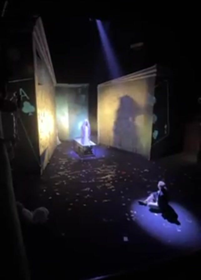 The scene is a theatrical production with dark lighting. The stage features cardboard-like structures on either side with the suit of spades on them. The stage is littered with confetti-like debris. In the center, a draped figure stands on a small table. A single beam of light illuminates the figure. A second figure is seated on the floor with a spotlight on them. The audio consists of male singing.