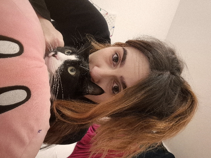 - "A woman poses at an angle with a black and white cat and a pink pillow" by FM-DaNa73, licensed under CC BY 4.0