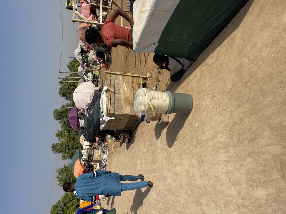 The image displays an outdoor market scene in Iddo Tudunwada, Nigeria, under a clear blue sky