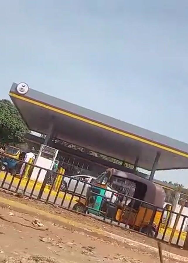 MANDO gas station on a sunny day. There are several vehicles parked at the pumps, including a yellow and green minibus and a three-wheeled vehicle. People are visible at the gas station. The station is surrounded by a black metal fence and some trees. There are power lines and poles visible. The ground is dry and dusty. A person riding a bicycle passes by.