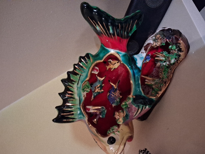 A colorful fish-shaped decorative piece with an open interior. The fish has black and green fins with gold accents, a red head and tail, and a white bottom. Inside the open fish body, there are miniature landscapes with trees, plants, and possibly other fish. The interior is primarily red and appears to be velvet-lined. It's positioned against a plain beige surface.