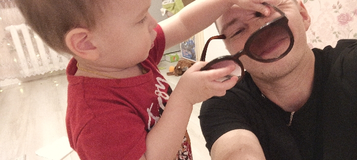 The scene is set indoors within a residential property in Марковский, Russia. A young child, wearing a red short-sleeved t-shirt with white lettering and a gold-colored chain around the neck, is positioned on the left side of the frame. The child's left hand holds a pair of large, dark-framed sunglasses, while the right hand rests near the forehead and eye area of an adult. The adult, visible from the neck up, wears a black t-shirt and a silver-colored chain. The adult's eyes are mostly closed or squinting, and the mouth is open; facial stubble is visible on the chin and jawline. In the background, light-colored wallpaper with a repeating pattern of pink roses and green leaves is visible. A white, slatted radiator cover is present on the far left. The floor appears to be a light-colored surface, possibly wood, with small, warm-toned decorative string lights positioned along its edge. Blurred objects in the distant background include a blue-framed item and various toys.