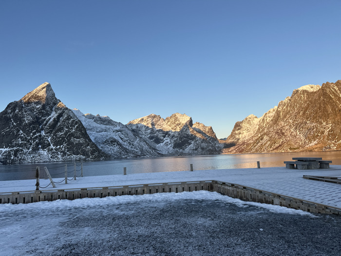 This image depicts a winter scene in Hamnøya, Norway. The foreground features a snow-dusted wooden pier extending across the lower portion of the frame, turning right into a wider platform. On the left section of the pier, three wooden posts with taut chains strung between them are visible. On the wider platform to the right, a stone picnic table with attached benches is present, covered in a thin layer of snow. The ground immediately in front of the pier exhibits patches of dark ice and snow. A calm body of water, likely a fjord, occupies the midground, reflecting a clear blue sky and warm golden light. In the background, majestic, rugged mountains, heavily snow-capped, rise steeply from the water's edge. The peaks on the left are partially illuminated by golden sunlight, while the mountains towards the right are bathed in a prominent warm, golden glow from a low-angle sun. The sky above is clear and light blue. No individuals are visible, and no discernible actions or interactions are occurring. The environment is characterized by clear, cold, winter conditions.
