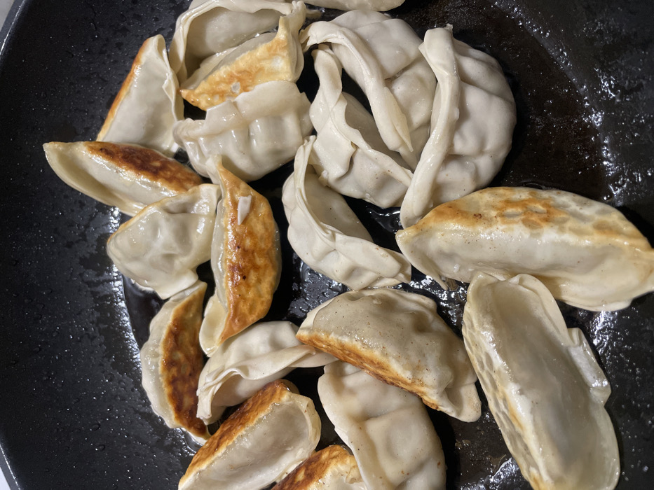 - "The image displays approximately two dozen pan-fried dumplings, commonly known as gyozas, contained within a dark, round frying pan" by FM-GgSpJ3, licensed under CC BY 4.0