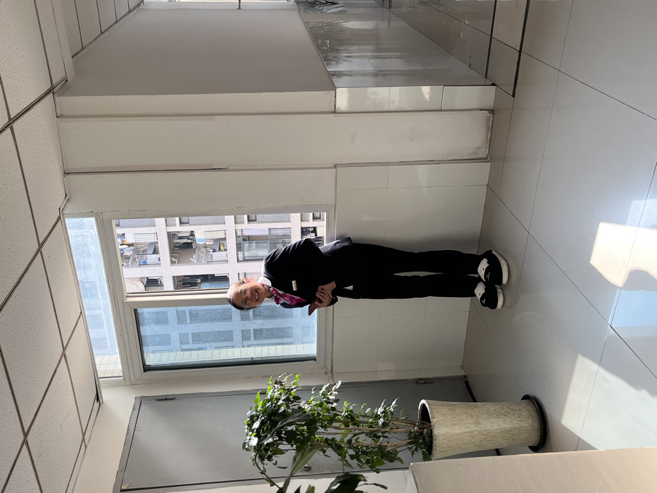 A woman in a black suit and pink scarf stands near a window with buildings visible outside. She's smiling at the camera. A potted plant sits in front of a door adjacent to the window. The room has white tiled floors and a white paneled ceiling. A large white structure occupies the top of the frame.