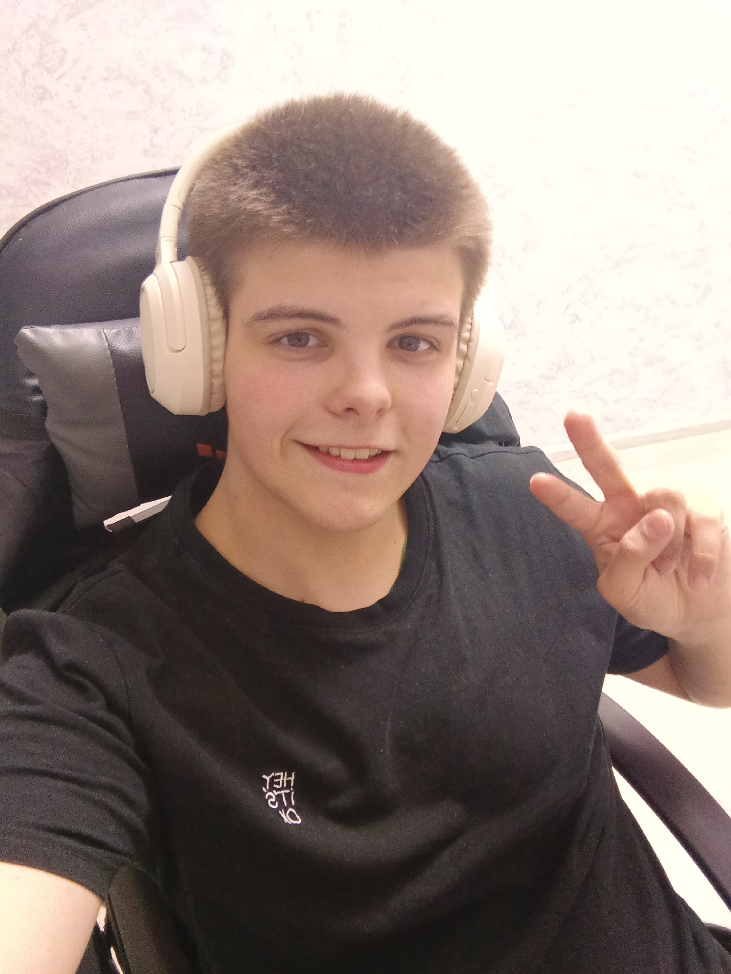 A young person with short brown hair is sitting in a black gaming chair, wearing beige headphones and a black t-shirt. They are holding up a hand in a peace sign. The background is a light-colored wall. The location is Andreyevo, Russia.