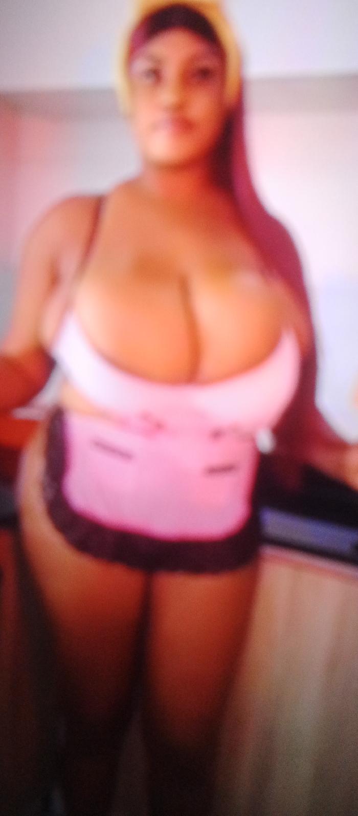 A single individual is depicted in a full-body, vertically oriented, and significantly blurred image. The location is an indoor setting within the city of Unknown, Unknown. The subject is an individual with dark skin, appearing to be female, standing centrally and facing the camera directly. The individual's head is covered by a light-colored or yellow headwrap, beneath which dark hair, possibly maroon or purple, is visible flowing down the right side. The individual wears a white brassiere and a pink apron with a dark-colored trim along its lower edge. The apron also features two small, dark, horizontally oriented rectangular elements near the waist. The midsection and upper legs are visible, implying the absence of additional clothing in those areas, though details are indistinct due to the image blur. The background consists of a light-colored wall or surface behind the subject. To the right, at a lower elevation than the subject's mid-body, a dark, flat surface, potentially a countertop, is visible. No specific actions or interactions beyond posing for the photograph can be discerned. The environment is dimly lit and out of focus.