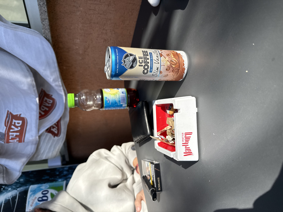 The scene depicts an outdoor table setting in Tsalapitsa, Bulgaria, under direct sunlight. A dark grey table surface occupies the foreground. On the left side of the frame, the lower torso and left arm of an individual wearing a light grey hooded sweatshirt are visible. Arranged on the table, from left to right, are several objects: a black lighter rests partially over a pack of Sobranie cigarettes. To its right, a black bifold wallet is placed. Adjacent to the wallet is a white plastic ashtray with a red interior, branded "MARLBORO CRAFTED" in red lettering on its side. The ashtray contains multiple discarded cigarette butts and paper debris. Further to the right, a transparent plastic bottle with a green screw cap contains a dark reddish-brown liquid; a blue and yellow label is visible on its side. Immediately next to the bottle, an opened slim aluminum can of "ICE COFFEE Slim Vanilla" stands upright. The can's label displays text including "WITH REAL COFFEE EXTRACT," "NO ADDED SUGAR," and features a black and white stylized animal head logo; its pull-tab is in the open position. The background features a brown wall. Above the wall, a white fabric material, possibly an awning or banner, hangs. This material displays a repeating, mirrored red text logo that appears to read "PAVNA." A partial view of a blue commercial cooler or refrigerator, bearing the "Bo" brand, is visible in the far left background.