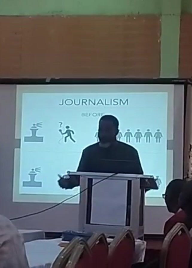man presenting to an audience from behind a podium. He is gesturing with his arms. A projector screen behind him displays the word "JOURNALISM" and the word "BEFORE" above a graphic depiction of people. Several people are seated in front of him, some with their backs to the camera. One person is wearing a traditional hat. The room is simply decorated with wood paneling and a whiteboard is visible in the background. There are tables in front of the audience, covered in white cloths.