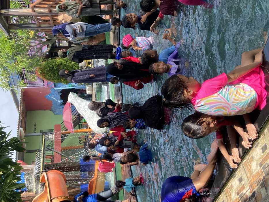 A group of children and adults enjoy a water park. Some children are in the water, playing near the edge of the pool, while others are on a slide. Several women wearing hijabs stand near the pool, watching the children. A building with a colorful mural is visible in the background, along with trees and a slide. The water is clear and reflects the sky, suggesting a sunny day.