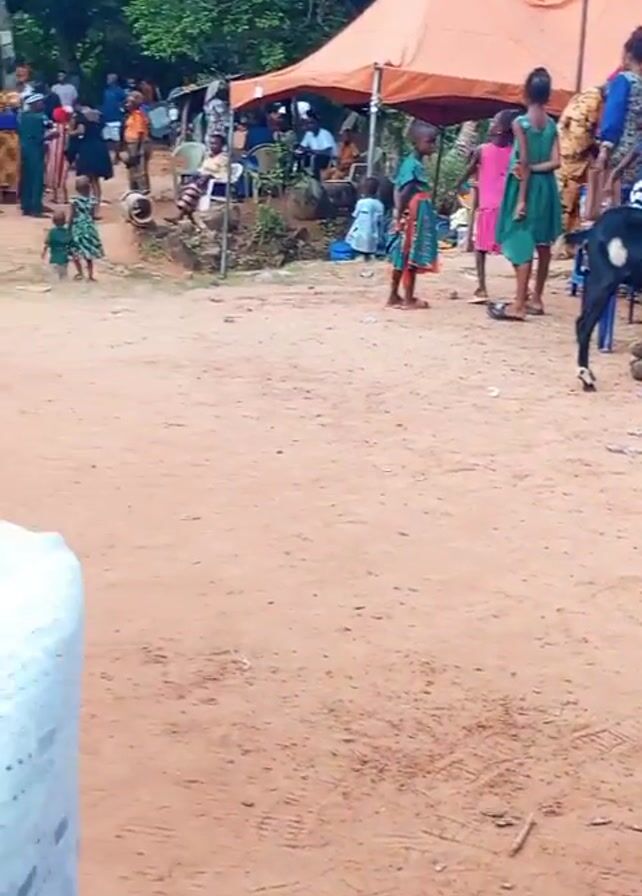 n outdoor event, possibly a party or a celebration, in what looks like a rural area. The ground is a red-orange dirt. Several people, including children, are seen milling around. There are tents set up to provide shade, and plastic chairs are arranged for seating. A goat stands in the middle of the area. A table is covered with a white lace tablecloth, with a large silver bowl of what appears to be salad, and some plates on it. Bibles are stacked on the table.