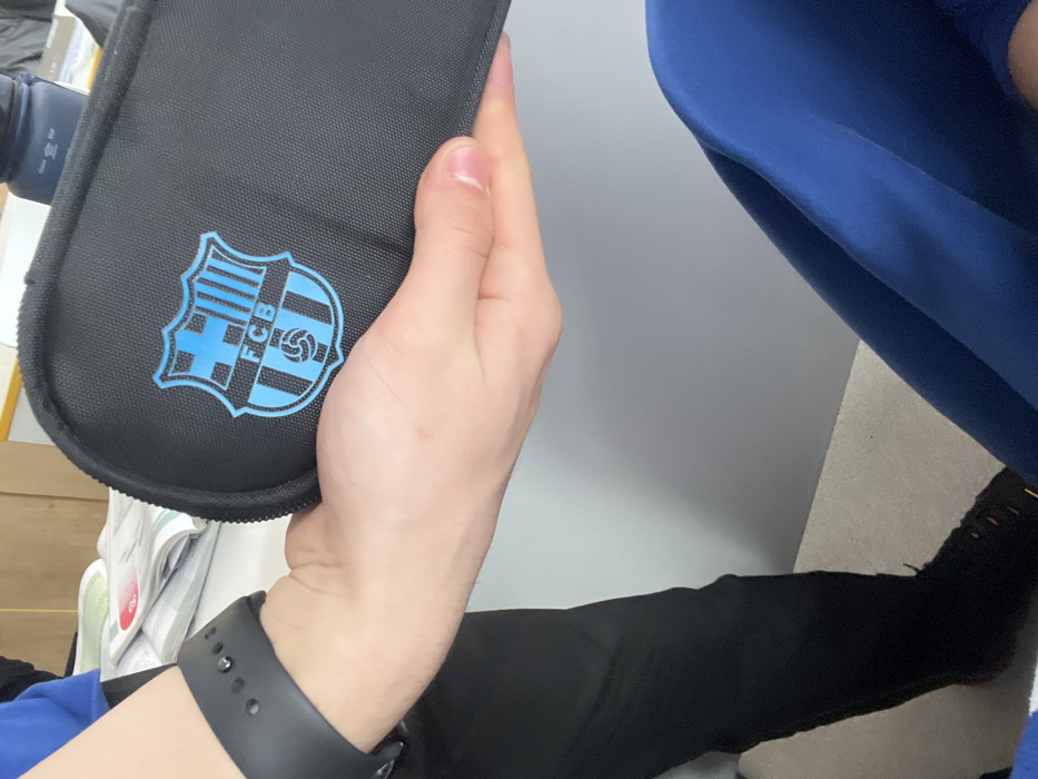 An indoor scene depicts a light-skinned human hand holding a black zippered textile pouch. The pouch features a light blue FC Barcelona crest logo. A black smart watch is visible on the wrist of the hand. To the upper left, a portion of a blue garment is visible. Below the hand, a leg clad in black trousers and a black athletic shoe with orange accents is present. To the right, a leg wearing royal blue athletic trousers is visible. The background consists of a light-colored surface, possibly a desk, with papers and a dark blue cylindrical object, against a light grey wall. The specific location within the city of Burgas, Bulgaria, cannot be determined from the provided image.