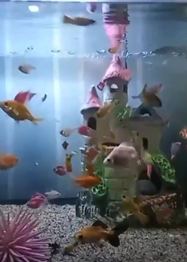 rectangular fish tank filled with water, gravel substrate, plastic plants, and a castle decoration