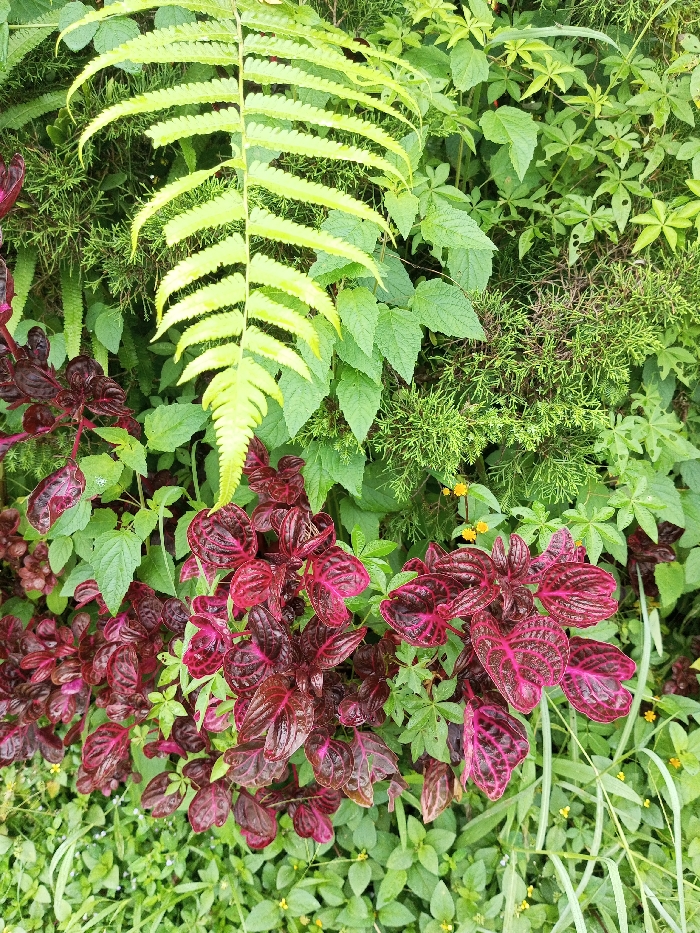 A lush, verdant scene features diverse foliage. A large, light green fern frond dominates the upper portion, contrasting with the deep burgundy hues of nearby leafy plants. Interspersed among these are various green plants, including small-leaved ground cover and taller plants with rounded leaves. Tiny yellow flowers dot the lower right, adding subtle pops of color to the otherwise intensely green and reddish-purple palette. The composition is a dense tapestry of textures and shades, creating a vibrant, natural mosaic.