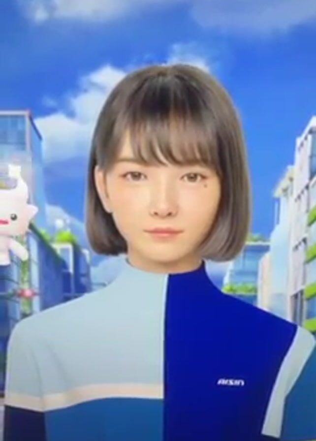 - "A video shows a digital rendering of a young woman with short brown hair and bangs, wearing a color-blocked blue and white top with "AISIN" on the chest" by FM-J9Tlk2, licensed under CC BY 4.0