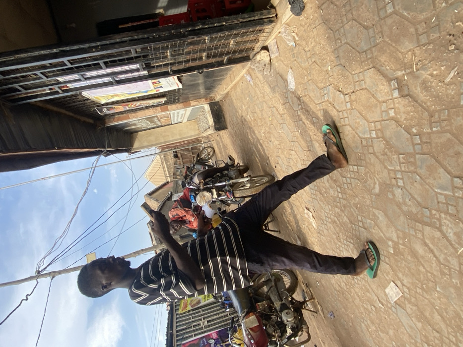 A man in a striped shirt and dark pants stands on a textured sidewalk, holding a phone. He wears green flip-flops and is framed by buildings and motorbikes. Above him, power lines stretch toward a blue sky. The angle of the photo is slightly tilted, creating a diagonal composition.