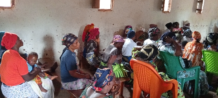 This image depicts an indoor gathering of approximately 25-30 individuals, predominantly adult women, located in Konongo, Democratic Republic of the Congo