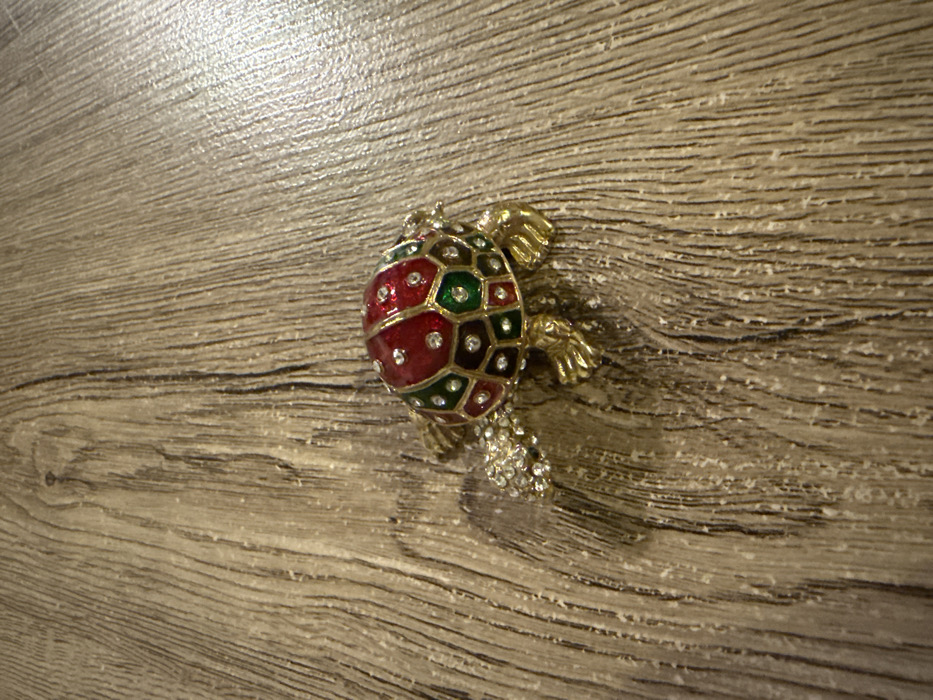 - "The scene depicts a single decorative turtle figurine situated on a light brown wooden surface in Chantepie, France" by FM-o3Fqy2, licensed under CC BY 4.0