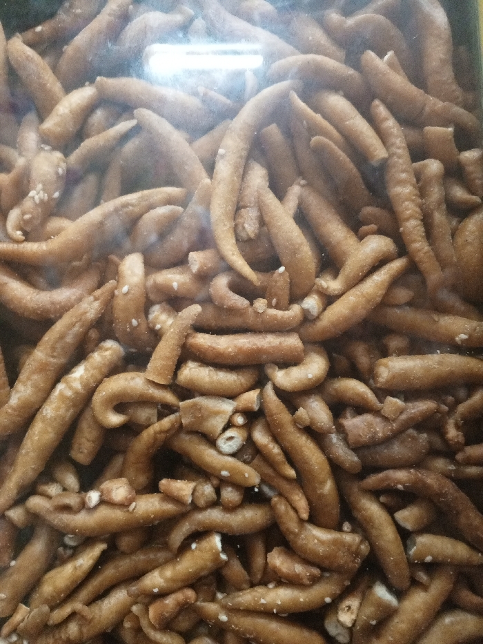 - "The image displays a full-frame, close-up view of a large quantity of light brown, irregularly shaped snack items, observed through a clear, reflective surface, likely a display case, in Batheay, Cambodia" by FM-kw8pJ2, licensed under CC BY 4.0