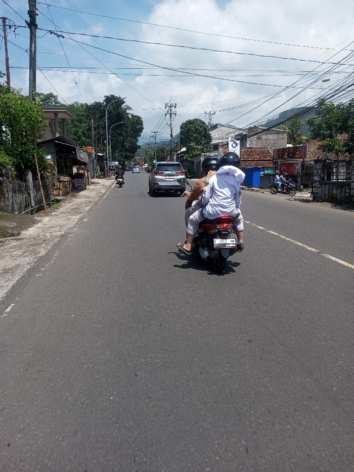 The image displays a daytime street scene on a paved road in Ura-Dozhi, Bhutan. A dark-colored scooter, with license plate F 6943 MH, is positioned slightly right of center in the foreground, moving away from the viewer. It carries two occupants: a driver in a dark helmet and light brown attire, and a passenger in a white long-sleeved top and white pants, who is either barefoot or wearing sandals. Ahead of this scooter, a silver SUV travels in the same direction, followed by another scooter further down the road. The road surface is dark grey asphalt, marked by a faint white dashed line on the right. A lighter grey concrete sidewalk or shoulder is visible along the left edge. Utility poles with multiple overhead wires line both sides of the road. On the left, several low-rise structures with corrugated metal roofs, possibly small shops, are visible amidst dense green vegetation. On the right, residential-style buildings are present, one featuring a "BMW" logo sign. In the background, green, tree-covered hills or mountains are visible under a partly cloudy sky with scattered white clouds. The scene is illuminated by natural sunlight.