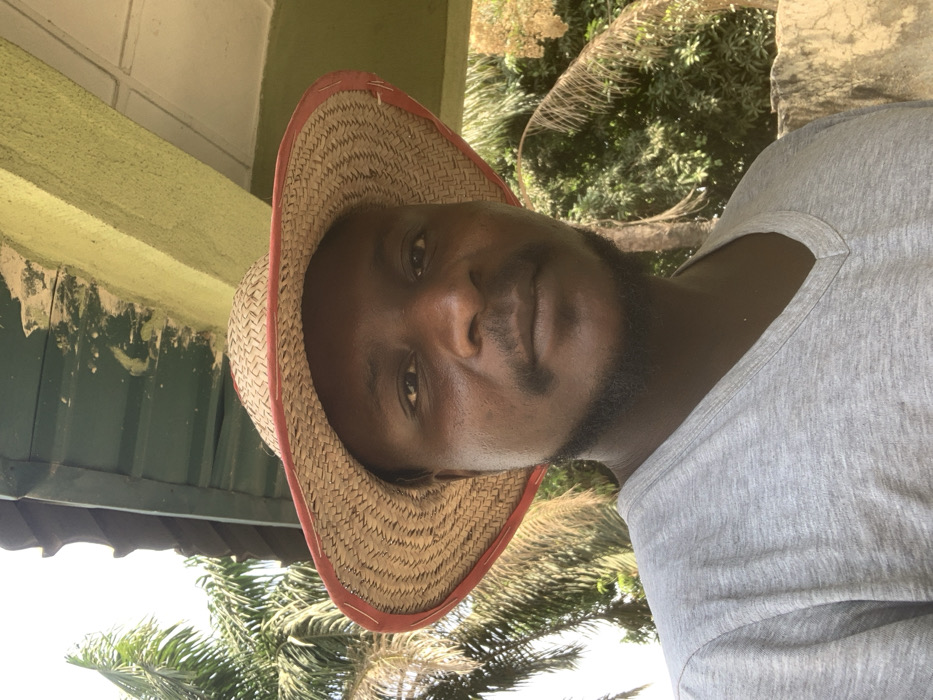 The image displays a head-and-shoulders portrait of an adult male. He has dark skin, a short dark beard, and a mustache. He is wearing a light grey V-neck t-shirt and a woven straw hat with a prominent red brim. His eyes are open, looking directly at the camera with a neutral expression. The scene is outdoors, under bright daylight. In the background on the left, several palm fronds are visible, indicating tropical vegetation. On the right, a light green painted wall surface and a section of a dark green corrugated roof are present, suggesting a building or an overhang structure. Further right, dense green foliage and a light-colored wall or stone structure are partially visible. No specific actions or interactions are depicted. The location is a city of Unknown, Unknown.
