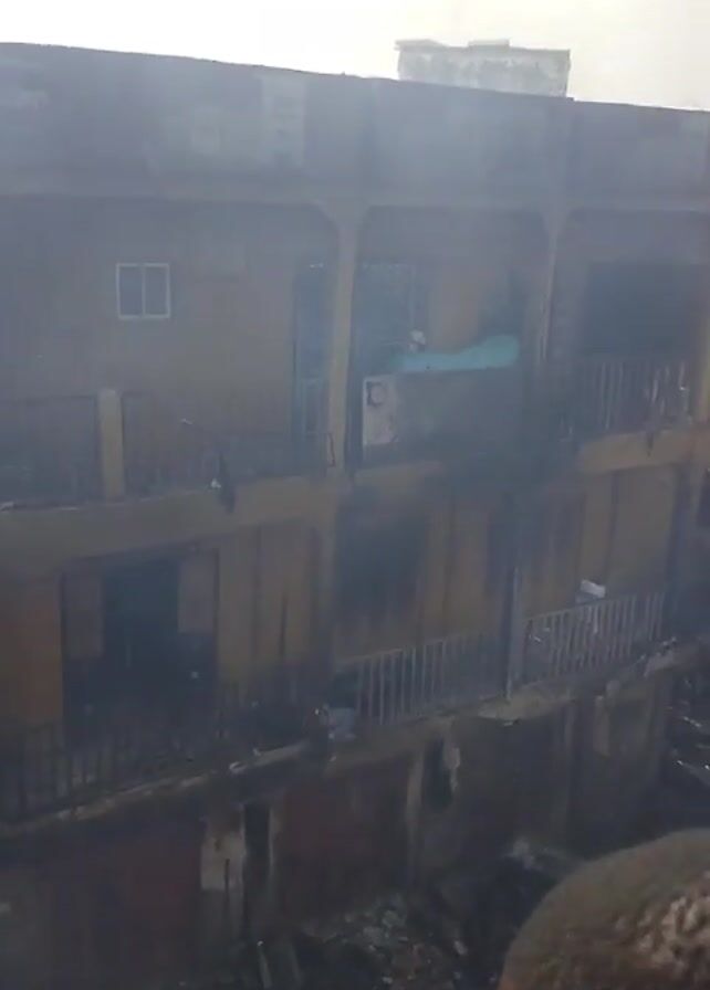 destroyed building following a possible fire. The building, two stories high, has suffered significant damage, with visible charring and debris. A crowd of people is gathered around the site, observing the aftermath. Thick smoke obscures the surrounding area. A palm tree stands near the building. The scene is chaotic and filled with debris, indicating a substantial event. A firetruck is visible amid the crowd.